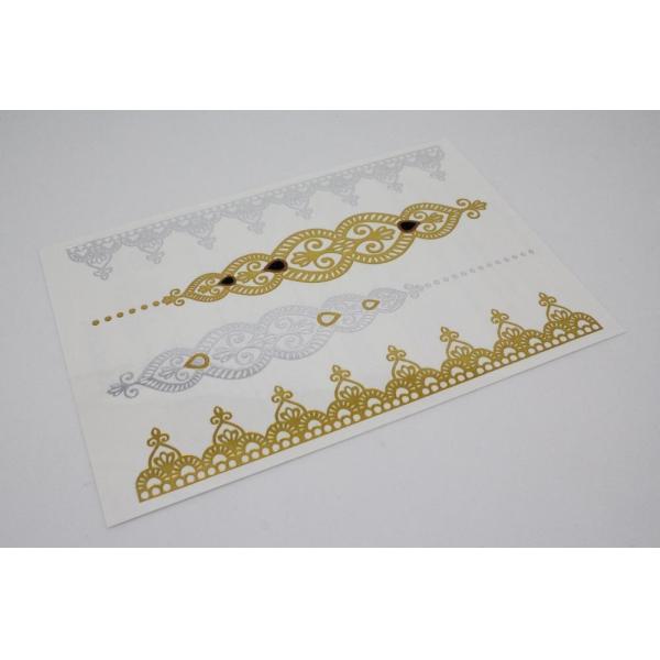 Jewelry temporary tattoos are made from silver and gold foil that shines like metal. Just cut out the design you want, peel off the clear protective sheet, position it on your skin, then wet it with a cloth or sponge. After 30 seconds, remove the paper backing and your tattoo is ready to go! Most of our designs will last 3-5 days with normal use. To remove, just apply alcohol or baby oil and wipe off. Whether you are headed out for a night at the club, a day at the beach, or just want to add a little bling to your body, these are the flash you are looking for.