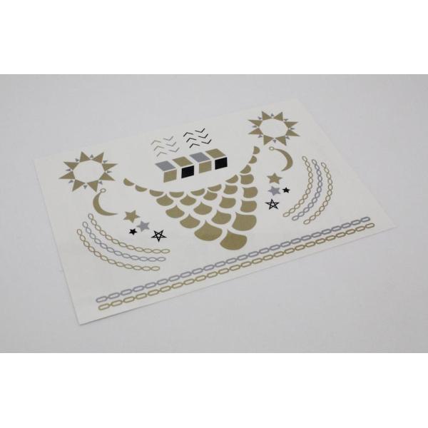 Jewelry temporary tattoos are made from silver and gold foil that shines like metal. Just cut out the design you want, peel off the clear protective sheet, position it on your skin, then wet it with a cloth or sponge. After 30 seconds, remove the paper backing and your tattoo is ready to go! Most of our designs will last 3-5 days with normal use. To remove, just apply alcohol or baby oil and wipe off. Whether you are headed out for a night at the club, a day at the beach, or just want to add a little bling to your body, these are the flash you are looking for.